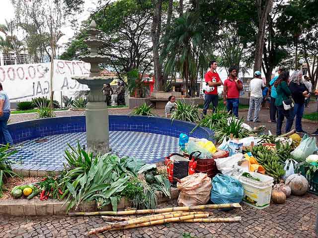Acampados levaram toneladas de alimentos em frente ao Fórum para mostrar que o terreno gera trabalho e renda (Foto: Douglas Mansur)